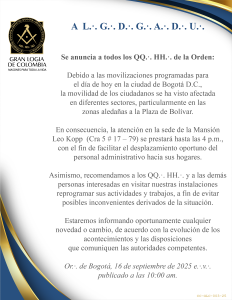 Se anuncia a todos los QQ.·. HH.·. de la Orden: Debido a las movilizaciones programadas parael día de hoy en la ciudad de Bogotá D.C.,la